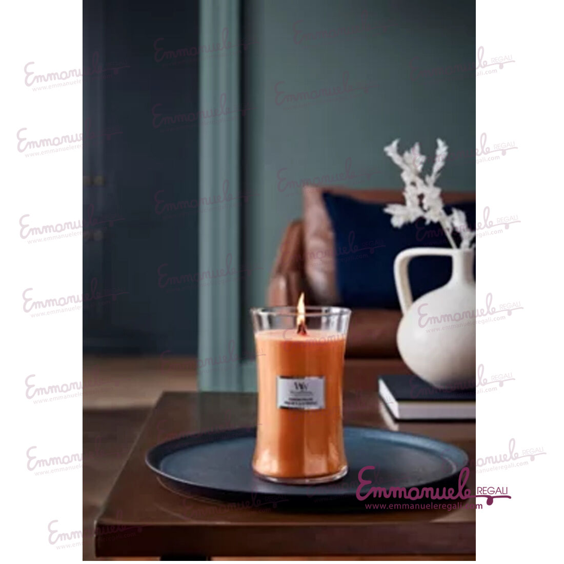 Le candele a clessidra infondono nella vostra casa profumazioni sofisticate con il dolce crepitio di uno stoppino in legno naturale brevettato per riprodurre il suono di un fuoco scoppiettante, gli stoppini sono realizzati a mano per ogni singola candela. Il caratteristico crepitio e la sinuosa fiamma danzante delle candele di forma ellittica WoodWick sono frutto della tecnologia brevettata HEARTHWICK Flame.