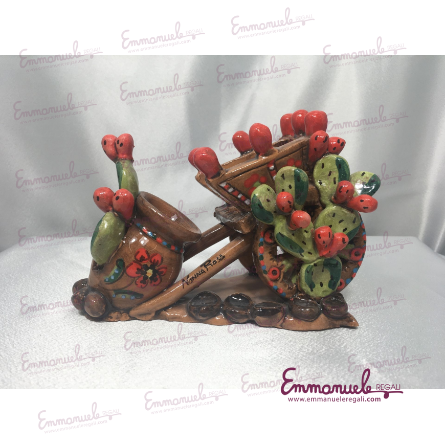 Carretto Siciliano realizzato in ceramica Siciliana dipinta a mano, con base a forma della nostra meravigliosa terra " LA SICILIA ", e con anfora e fichi d'india.