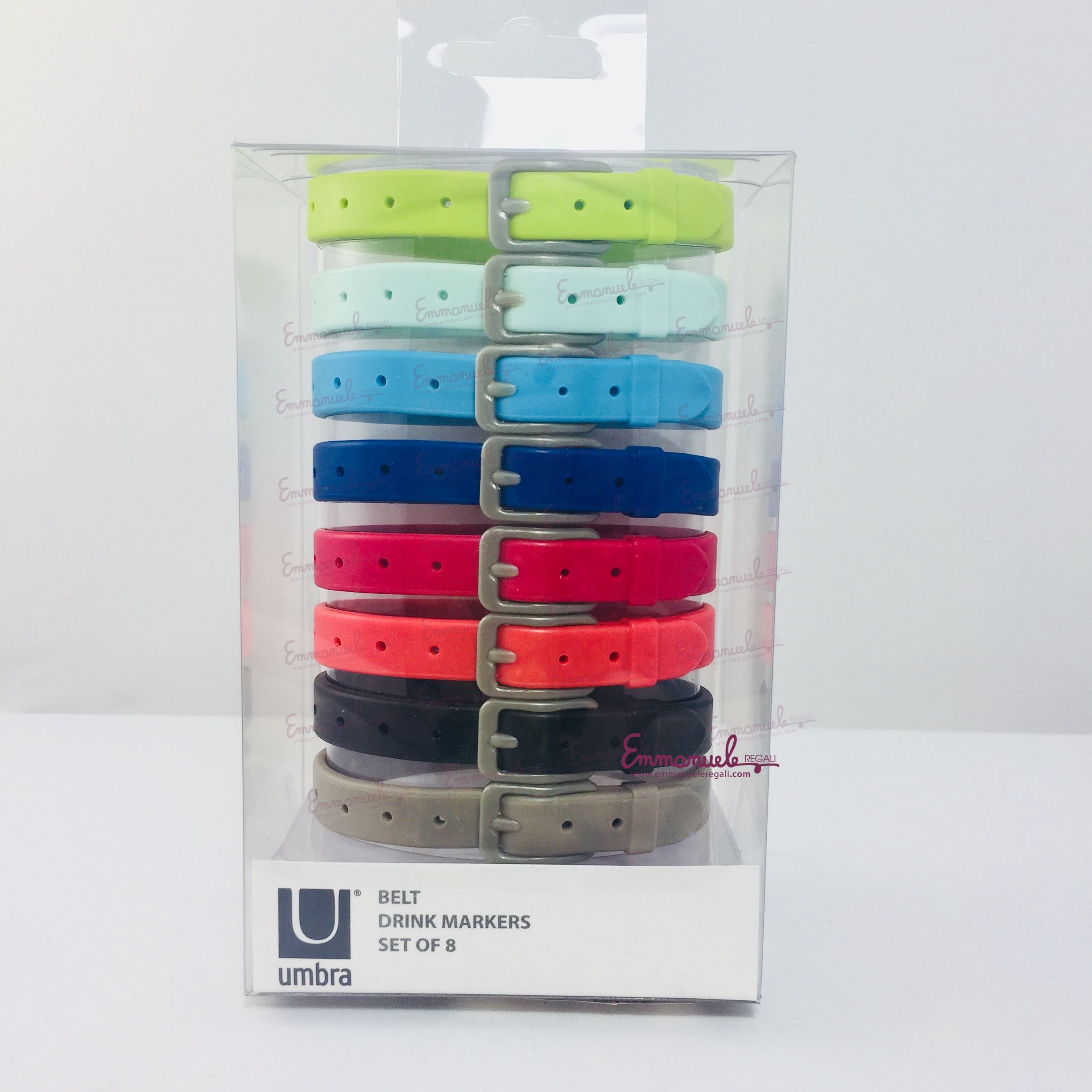 Set di 8 "Cinturini indicatori" progettati da Umbra, realizzati in gomma flessibile, adattabili a bicchieri, tazze, bottiglie e lattine.