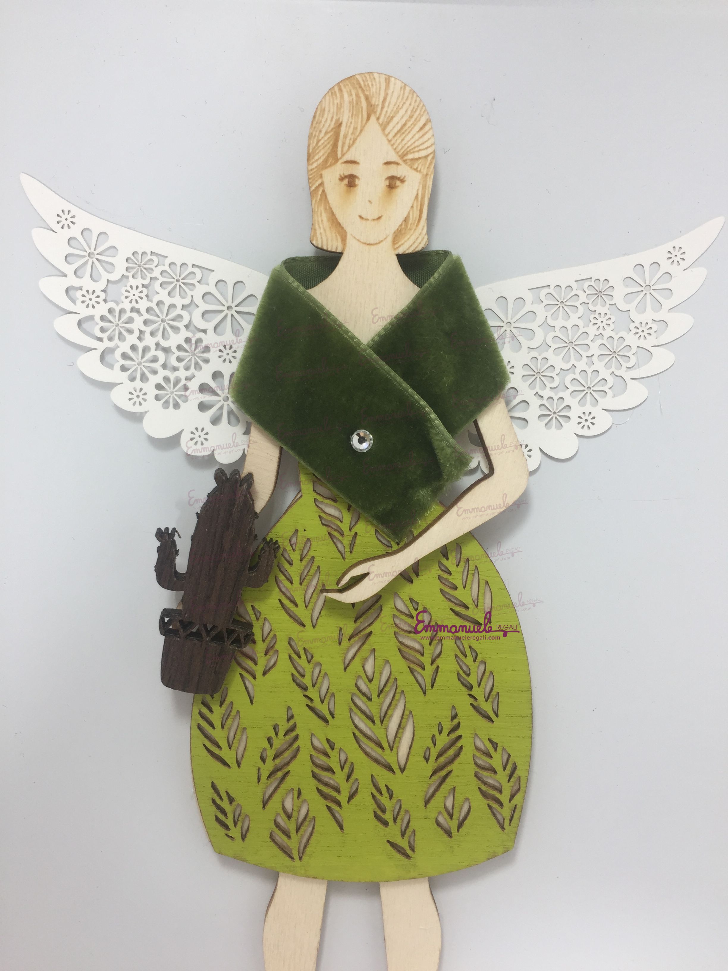Il quadretto di SD Laser è un pannello di legno laccato bianco con applicazione, il soggetto è realizzato in legno mentre le ali sono realizzate in carta, entrambe con taglio laser.