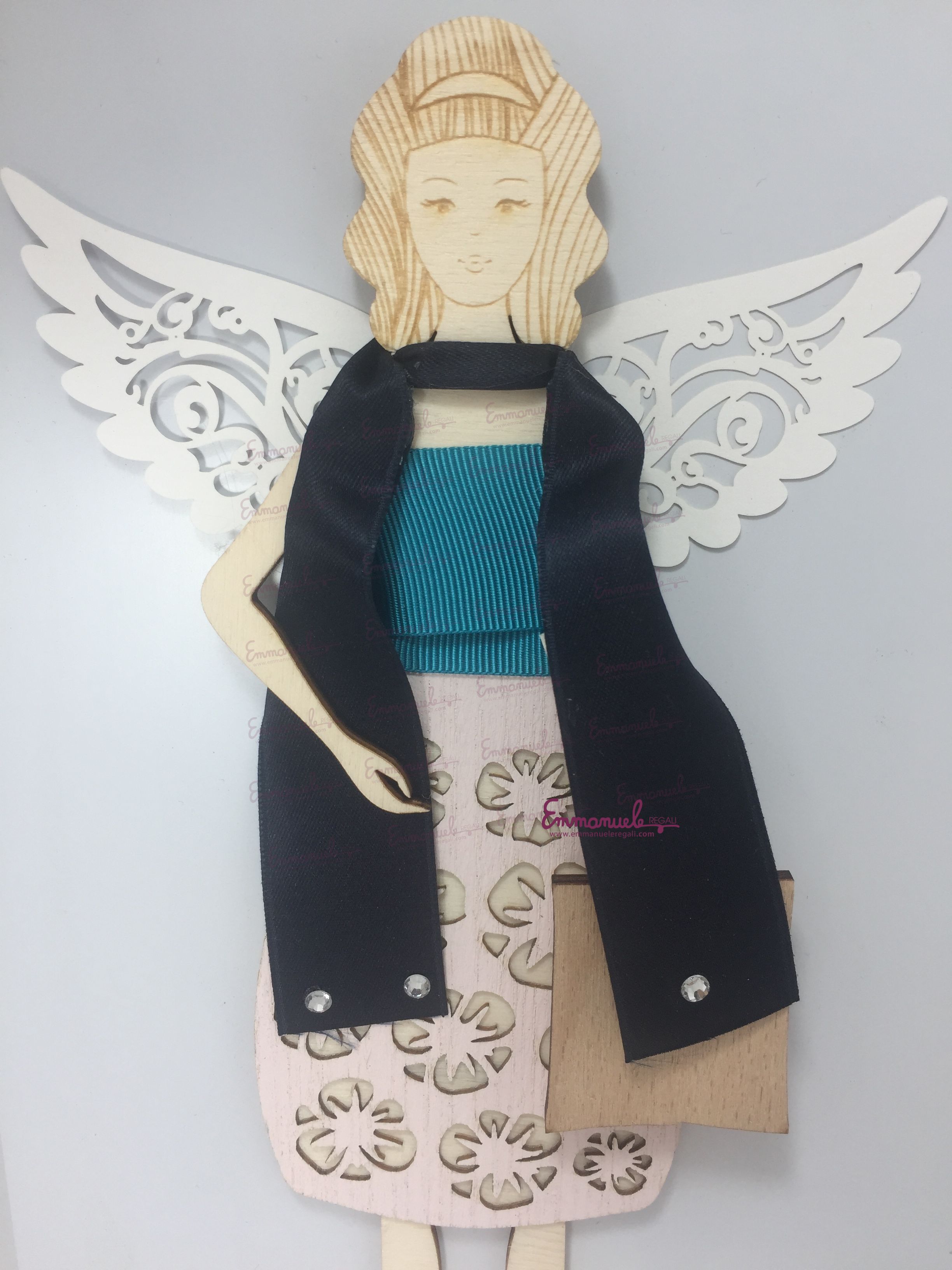 Il quadretto di SD Laser è un pannello di legno laccato bianco con applicazione, il soggetto è realizzato in legno mentre le ali sono realizzate in carta, entrambe con taglio laser.