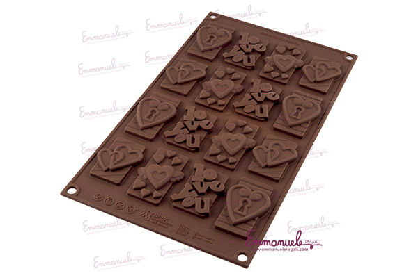 Choco Tags in love, è il romanticissimo stampo in silicone della Silikomart che riproduce dolci scritte d'amore, cuori e altre forme tenerissime.