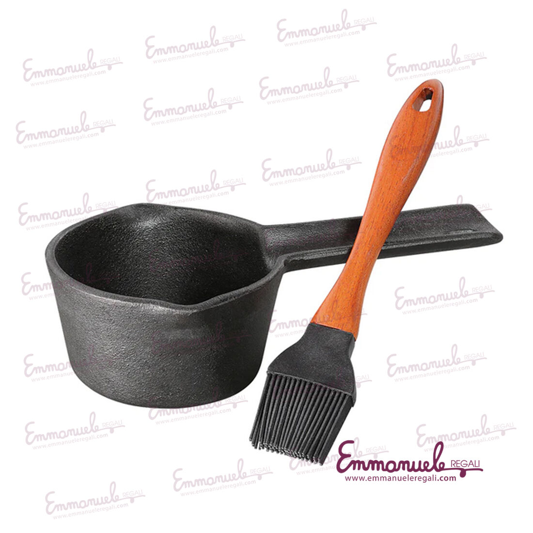 Il pentolino è realizzato in ghisa, il pennello in silicone e il manico in palissandro.